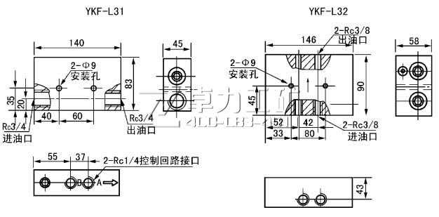 3、YKF-L31型2個(gè)與1個(gè)YHF-L1型液壓換向閥組合;YKF-L32 型1個(gè)與1個(gè)YHF-L2型液壓換向閥或YKF-L4型壓力操縱閥組合。
