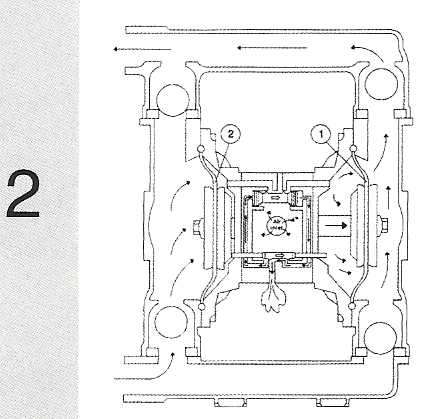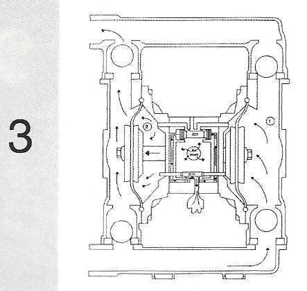 當膜片1位于高壓空氣下時,膜片1隨著沖程慢慢的移動到最大位置。同時,通過氣閥控制壓縮空氣慢慢充人膜片2后面的空間。此壓縮空氣勢必將推動膜片2慢慢遠離中間體,通過連桿的連接,膜片1開始移向中間體。,膜片2將擠壓膜腔室中介質(zhì)并通過水力作用在進口處的閥球上,使得閥球和闊座的接觸后而封閉進口管路。同時,同樣的水力作用在出口處球閥上并提升球閥,打開出口管路。另側(cè)的出口處球閥因壓力的作用而關(guān)閉,進口處的球閥同樣因壓力的作用而打開,液體也就被吸入泵腔室內(nèi)。